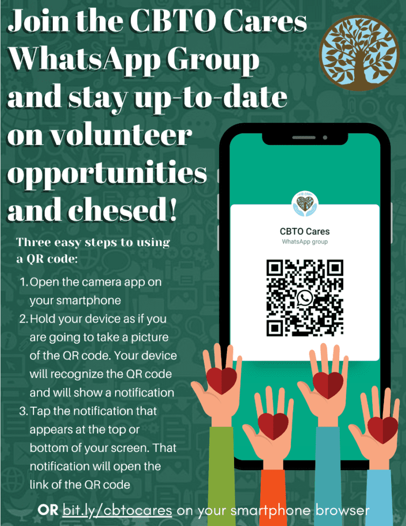 To volunteer, to join the chesed committee, or to be added to the CBTO Cares WhatsApp group, please send an email to shul@cbto.ca.