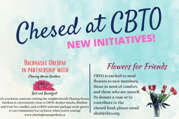CBTO is excited to send flowers to new members, those in need of comfort, and those who are unwell. To donate a vase or to contribute to the chesed fund, please email shul@cbto.ca. You can also contribute directly to the chesed fund online by clicking the button below.