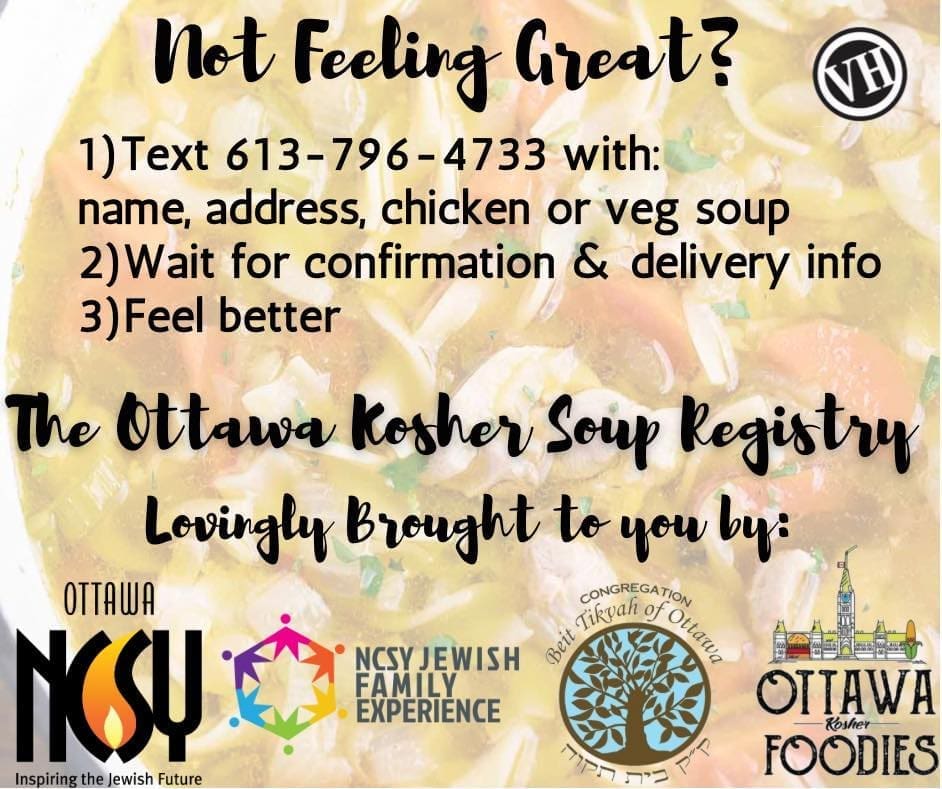 CBTO is excited to partner with Ottawa Kosher Foodies, NCSY, Jewish Family Experience, and the Ottawa Vaad HaKashrut (OVH) to bring the Ottawa Jewish community the “Ottawa Kosher Soup Registry.” If you know someone, be it a family member, friend, or neighbour who is not feeling well, please let us know so that we can arrange delivery of a chicken or vegetable soup. All requests are kept in the strictest of confidence.